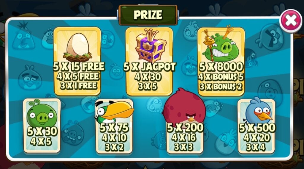 Các biểu tượng trong trò chơi bao gồm các loài chim khác nhau từ trò chơi Nổ hũ Angry Birds. Cùng với các trứng và vật phẩm khác. Mỗi biểu tượng có giá trị khác nhau và sẽ giúp cược thủ tham gia giành được số tiền thưởng hấp dẫn.